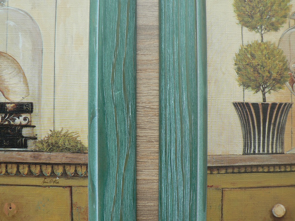 Obrazové reprodukce v dřevěném zeleném rámu.