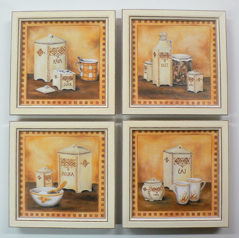 Obrazy do kuchyně, reprodukce jsou povrchově upravované.
